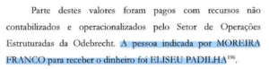 Segundo a denúncia, após tantos favorecimentos à Odebrecht, em 2014, foi a vez de Moreira Franco pedir um favor aos empresários: uma doação de R$ 4 milhões para a campanha de 2014. O texto afirma que Eliseu Padilha — apelidado pelos empresários da Odebrecht de “Fodão” — foi a pessoa indicada por seu “primo” para receber a parcela “não contabilizada” destes recursos.