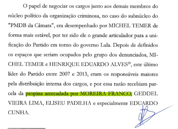 De acordo com o ex-Procurador Geral Rodrigo Janot, autor da denúncia, os dois — ao lado de Geddel Vieira Lima e Eduardo Cunha — eram os responsáveis pela arrecadação de propina a ser dividida entre a organização criminosa.