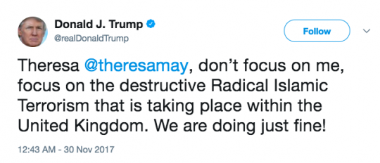 “Theresa, não se preocupe comigo. Preocupe-se com o terrorismo radical islâmico dentro do Reino Unido. Nós estamos muito bem!”