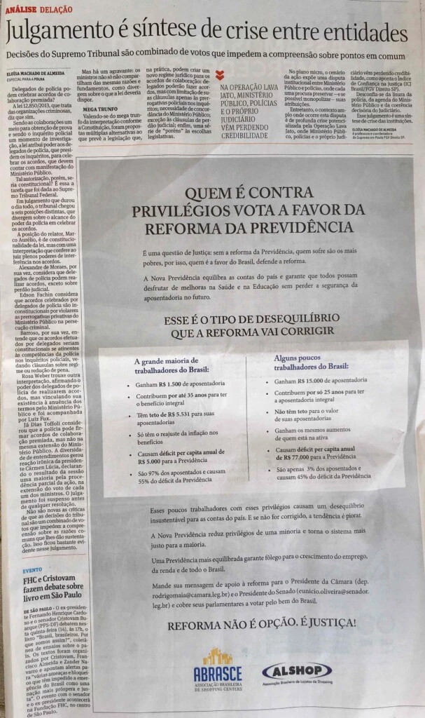 Dois dias após a reunião com líderes empresariais, pudemos ver o resultado da pressão governista estampado nos jornais. Como se já não bastasse o apoio maciço da mídia, pelo menos três grandes jornais (Folha de São Paulo, Estado de Minas e Correio Braziliense) amanheceram com gigantescas propagandas a favor da reforma contratadas pela ABRASCE — entidade representativa dos donos de Shopping Centers. O texto é tão alinhado ao discurso governista, que parece até que foi ditado por Moreira Franco: