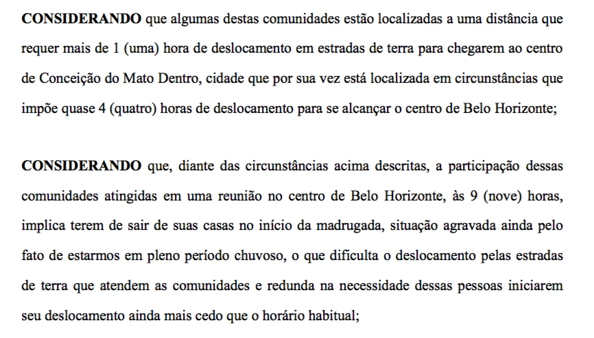 O Ministério Público do Estado de Minas Gerais entrou com uma recomendação para que a reunião seja reorganizada. O órgão considera que o local não será capaz de abrigar a todos os interessados e ressalta que, na última reunião, no dia 11 de dezembro, “cerca de 70 moradores de 8 comunidades atingidas diferentes se fizeram presentes”. O promotor de justiça Marcelo Mata Machado, que assina o documento, também considera que, além da limitação de espaço, o horário marcado para a reunião inviabiliza a presença dos cidadãos interessados — o evento está marcado às 9h da manhã, e a cidade de Conceição do Mato Dentro fica a 4h de distância da capital.
