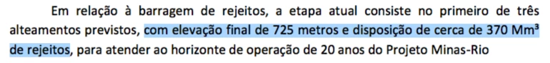 O objetivo é fazer três ampliações de forma que a represa chegará a ter cerca de 370 milhões de metros cúbicos de água e restos do processo de mineração. A barragem de Fundão, que rompeu causando o desastre de Mariana (MG) em 2015, tinha 55 milhões de metros cúbicos.