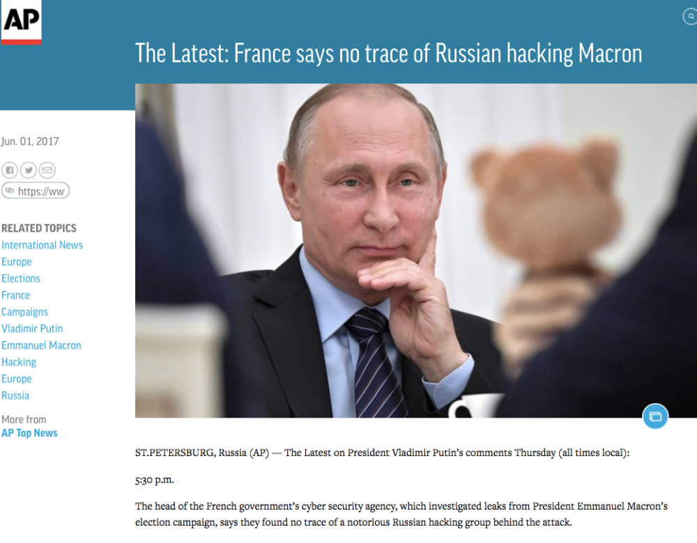 Nunca houve sinal de qualquer remoto interesse da Rússia nas eleições brasileiras. Quanto às alegações de Macron e da França durante as eleições, de que ele teria sido vítimas de hackers russos, nenhuma evidência verossímil foi encontrada na investigação conduzida pela própria agência de segurança cibernética da França, a despeito da aceitação sem crítica das acusações pelos veículos de mídia ocidentais. (O mesmo padrão se repetiu na Alemanha, onde aos estridentes alertas sobre a inevitabilidade da interferência russa sobre as eleições se seguiu, findo o período eleitoral, o reconhecimento de que não havia qualquer indício disso).
