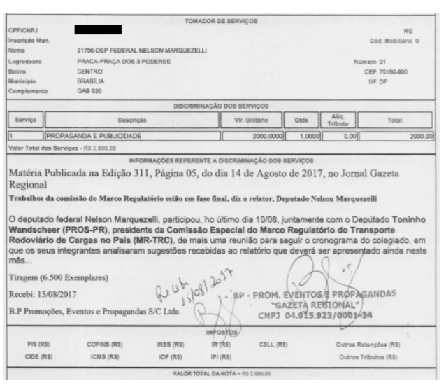 A maior parte das matérias pagas por Marquezelli foi publicada na Gazeta Regional, com tiragem de 6.500 exemplares e sem versão online. A relação entre o deputado e o jornal é intermediada pela empresa BP Promoções, Eventos e Propagandas, que cobra o valor fixo de R$ 2 mil por matéria publicada. No ano passado, foi gasto um total de R$ 96 mil em 48 reportagens. A BP é sediada em Tambaú, a 260 km da capital paulista. Um dos sócios da empresa, Luiz Fernando Aparecido Barbon, trabalhou na campanha de Marquezelli em 2014, tendo recebido R$ 6.942,00 por serviços prestados, de acordo com dados do Tribunal Superior Eleitoral.