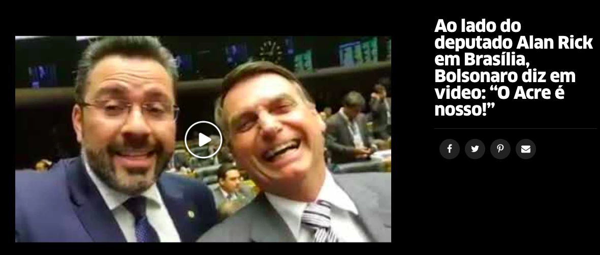 Em uma das matérias, Alan Rick afirma que “o povo brasileiro não aceita mais gastos com políticos e eleições”, e por isso teria votado contra o Fundo de Campanha eleitoral. Em outra publicação, o deputado Jair Bolsonaro (PSC/RJ) aparece em vídeo ao lado de Rick bradando “O Acre é Nosso”. Outras dezenas de reportagens relatam a destinação de emendas diversas a localidades do Acre e reuniões dos parlamentares.
