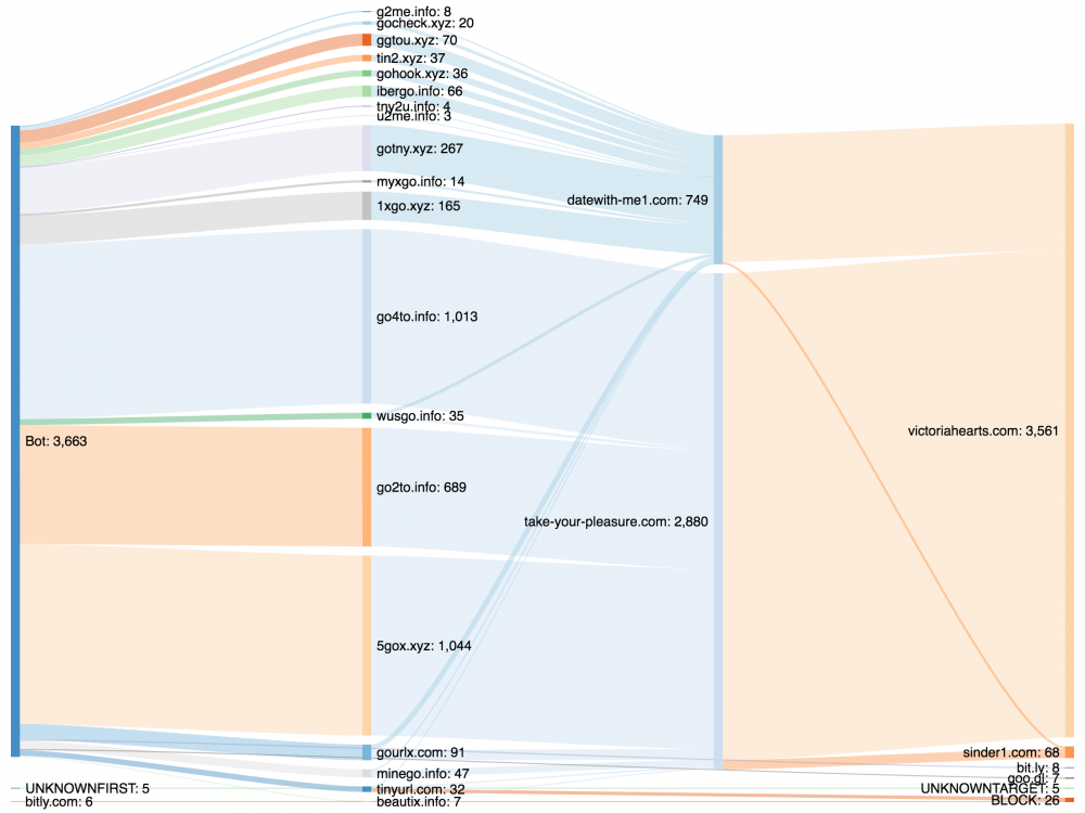A análise de dados ainda está em curso, mas o projeto já identificou algumas semelhanças entre os bots pornôs: o uso de imagens de um número reduzido de atrizes pornôs; uma sintaxe parecida na hora de postar links, que costumam apontar para dois sites pornográficos; e o uso de encurtadores de URL desconhecidos, com links para questionários que por sua vez redirecionam o usuário para um ou dois sites de paquera. Além de jogar o usuário de um site para outro, alguns sites associados aos bots mineram criptomoedas no navegador da vítima, usando o processador do computador invadido para ganhar dinheiro. Algumas contas parecem ter sido criadas como parte de uma rede de bots com o único intuito de mandar spam para outros usuários; outras parecem ter sido roubadas de pessoas de verdade – isso pode acontecer com quem usa senhas fracas ou os mesmos nomes de usuário e senha em sites diferentes, pois os hackers, depois de invadir uma conta, tentam usar esses dados para acessar outras contas do mesmo usuário.