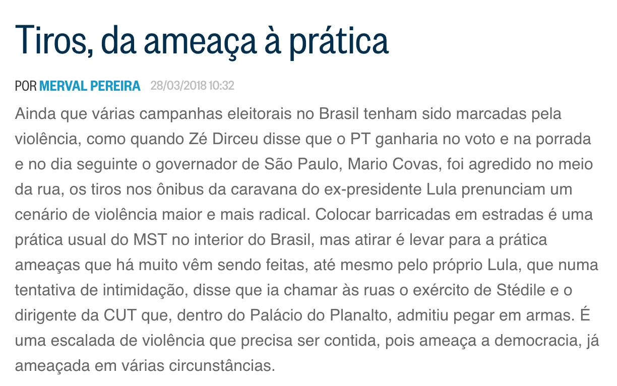 Nas manchetes dos veículos da grande mídia, a palavra usada para classificar o acontecimento foi “ataque”. O Valor Econômico foi o único a chamar o atentado de atentado. Mas, tudo bem, não chega a ser uma opção semântica inaceitável. O que é inaceitável é a opinião irresponsável de colunistas como Merval que foi capaz de criar um pot-pourri de casos de violência que teriam sido praticados pela esquerda. Um feito digno de um bolsominion comentarista de portal.