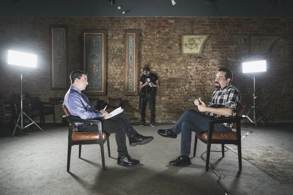 Guilherme Boulos sendo entrevistado por Glenn Greenwald no Rio de Janeiro.