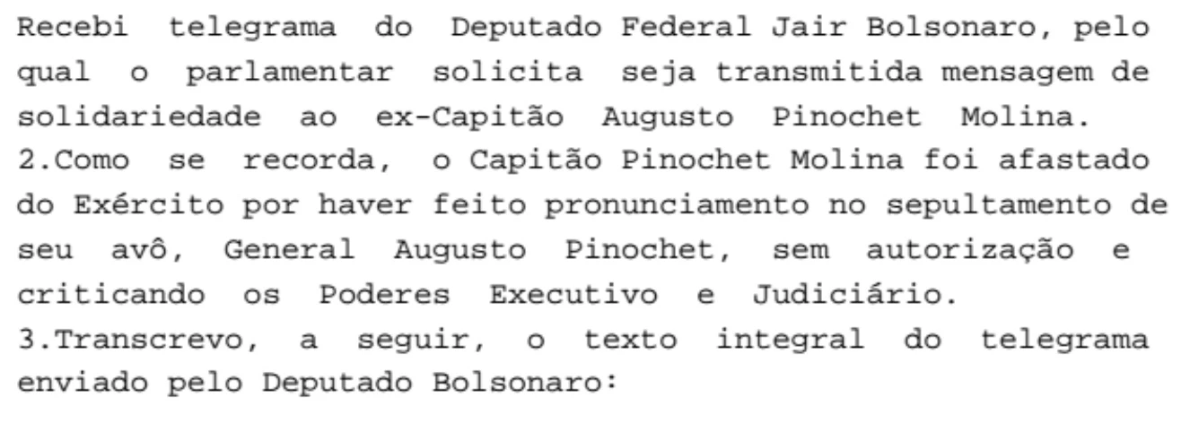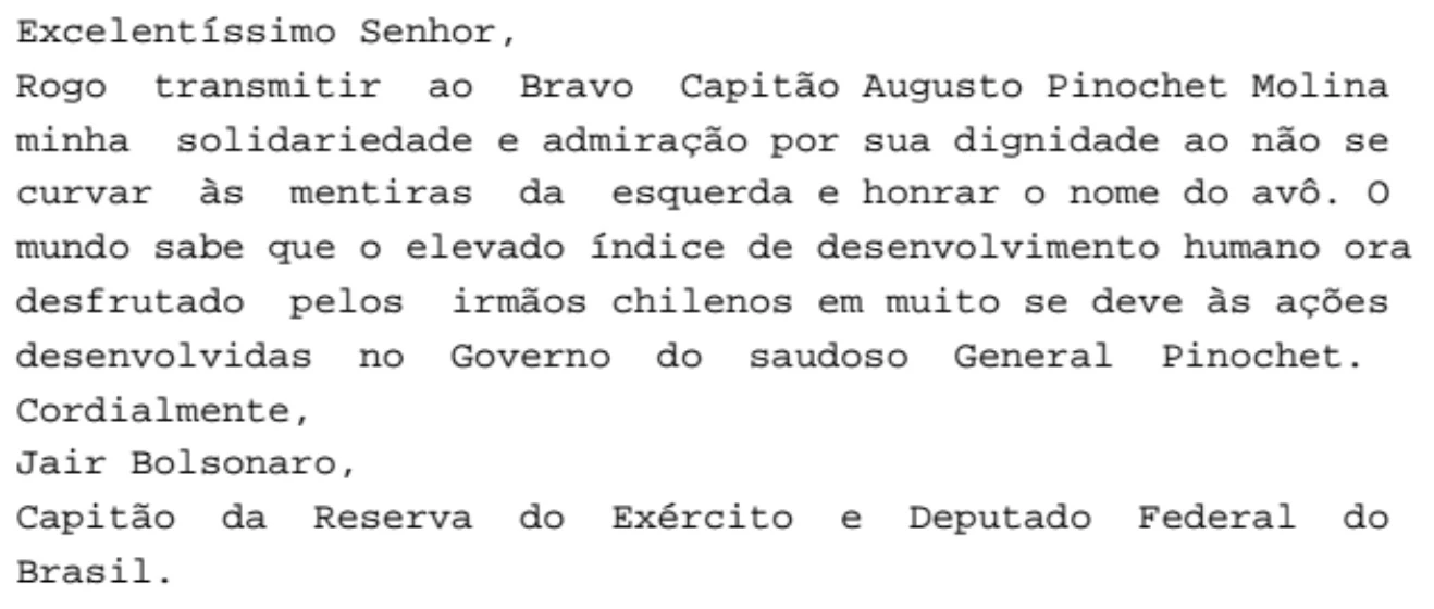 Nela, o agora candidato pedia que a embaixada enviasse uma mensagem de solidariedade ao neto do falecido ditador chileno Augusto Pinochet. A representação pediu a Brasília como proceder. O texto integral da mensagem de Bolsonaro era esse: