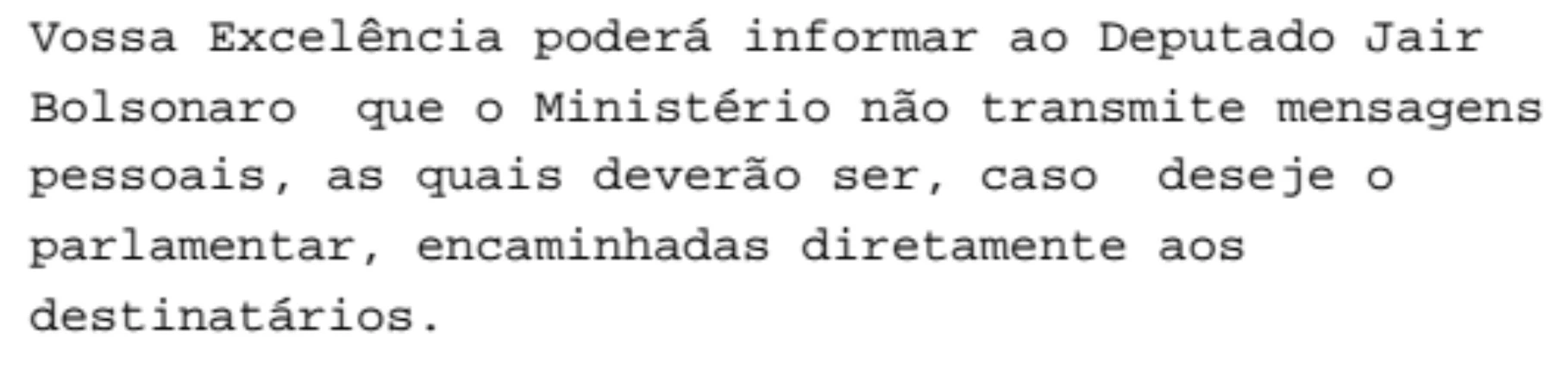 Começa assim uma mensagem da embaixada do Brasil em Santiago do Chile, endereçada ao Itamaraty, sobre um telegrama que o deputado federal Jair Bolsonaro enviou àquela representação diplomática em dezembro de 2006: