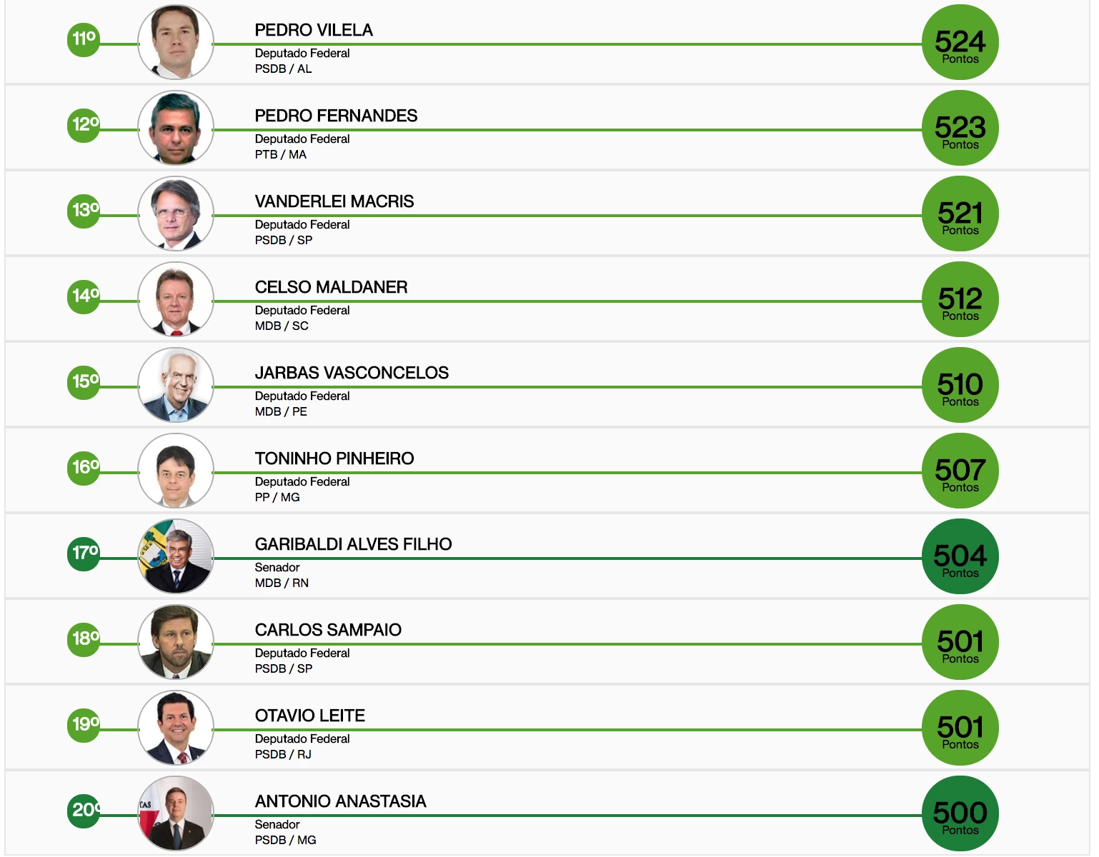 A deputada Luiza Erundina (PSOL), que não responde a nenhum processo, aparece em 505° lugar no ranking geral. O senador José Medeiros (Pode), que teve seu mandato cassado por fraude essa semana, aparece em 80° e é considerado o 3° melhor congressista do seu estado.