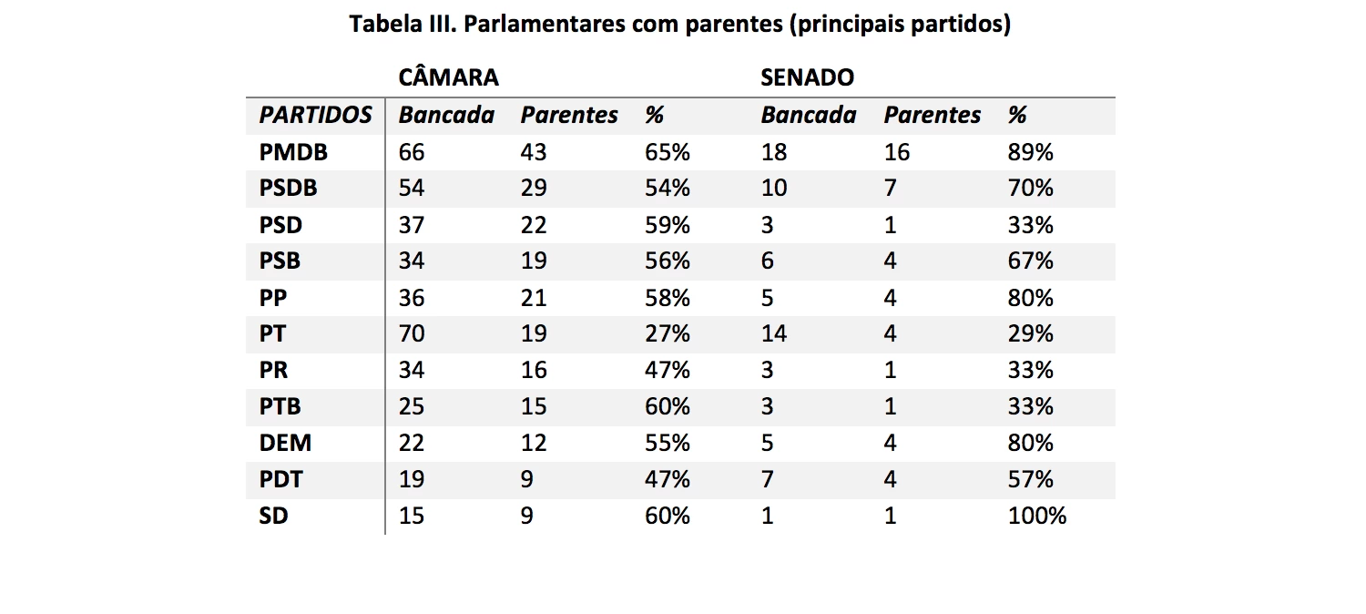 Na Câmara, MDB, PTB e SD lideram o percentual de deputados oriundos de famílias políticas. No Senado, MDB, PP, DEM e PSDB aparecem no pelotão de frente. Como era de se imaginar, o MDB é líder isolado nas duas casas. O PSDB, que se originou a partir do desgosto de certos filiados emedebistas com o fisiologismo do partido, tem se consolidado como o ninho das mais importantes famílias políticas do país. Richa no Paraná, Cunha Lima na Paraíba, Jereissati no Ceará, Virgílio no Amazonas, Neves em Minas Gerais, e por aí vai.
