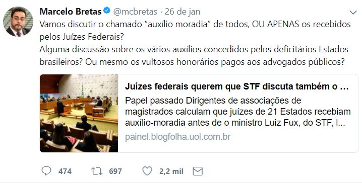 Ao ser questionado sobre o auxílio-moradia por um deputado, Bretas respondeu aos seus quase 60 mil seguidores no Twitter que tinha apenas ido atrás de um “direito”.