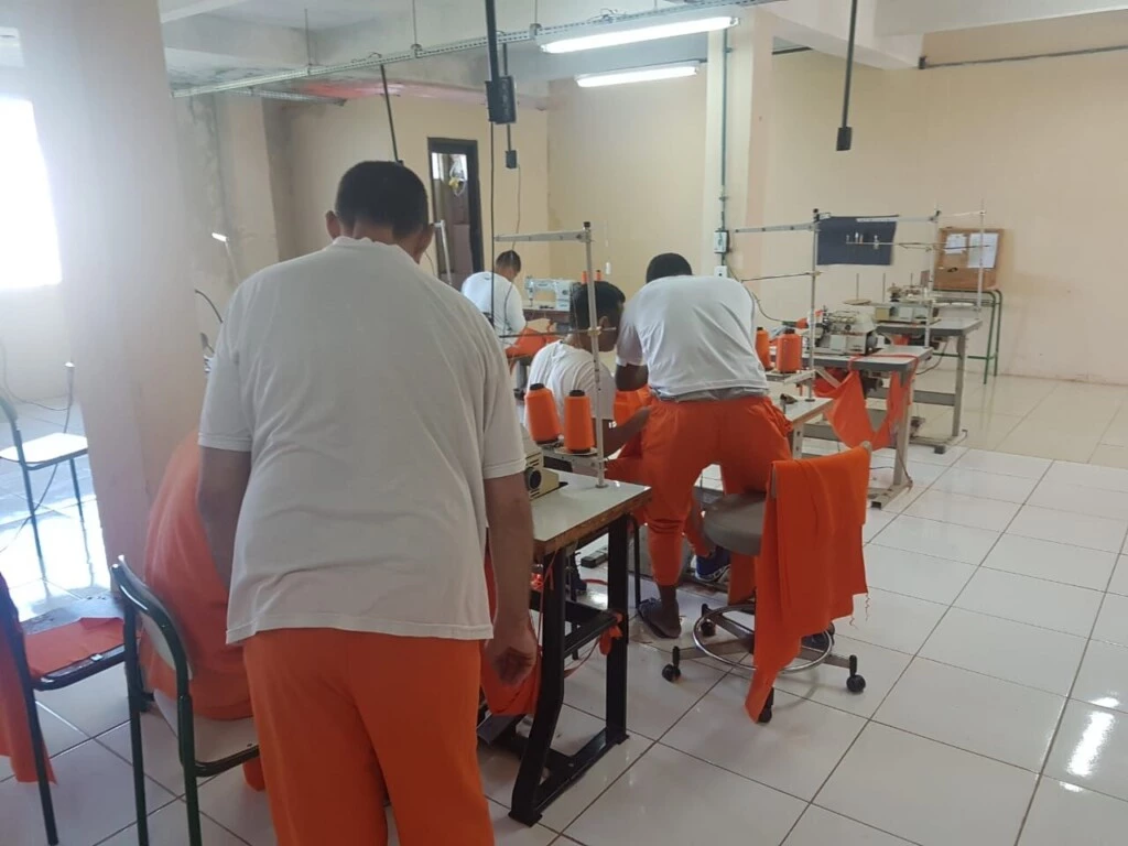 É meio da tarde numa oficina de costura. Os funcionários, todos homens, vestem uniformes alaranjados, ostentam tatuagens amadoras visíveis nas mãos, braços e, às vezes, no pescoço e operam máquinas de corte, ferramentas e tesouras afiadas. O ambiente, tranquilo e cordial, nos faz esquecer de onde estamos: uma prisão no maior complexo penitenciário do Paraná, em Piraquara, região metropolitana de Curitiba.