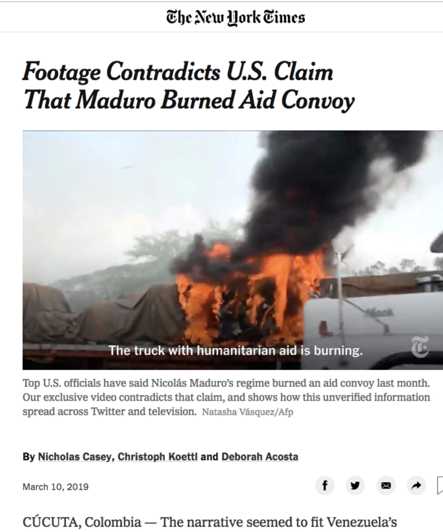 Mas, no sábado à noite, o New York Times publicou um vídeo detalhado junto com uma reportagem provando que toda a história era uma mentira. Os caminhões de ajuda humanitária não foram incendiados pelas forças de Maduro, mas por manifestantes anti-Maduro que atiraram um coquetel molotov que atingiu um dos veículos. E o vídeo do jornal mostra como a mentira se espalhou: de autoridades norte-americanas que anunciaram de maneira infundada que Maduro os incendiou até meios de comunicação que repetiram a mentira sem pensar.