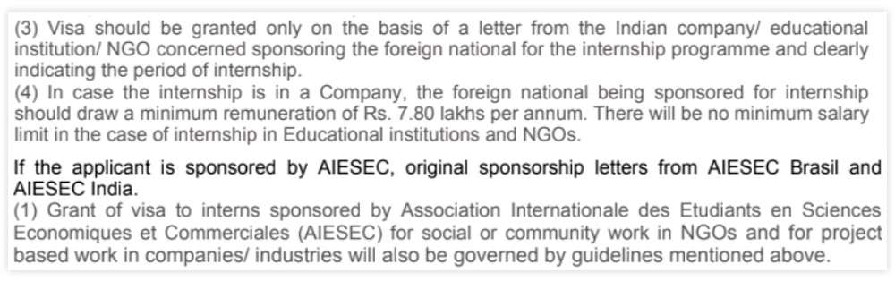 A legislação indiana para concessão de ‘Intern Visas’ requer que, em caso de estágio em uma companhia, o salário pago seja de 7,8 lakhs por ano, o equivalente a 65 mil rúpias indianas por mês (cerca de R$ 3,4 mil mensais). A remuneração oferecida a mim era R$ 3250 menor que esse piso.