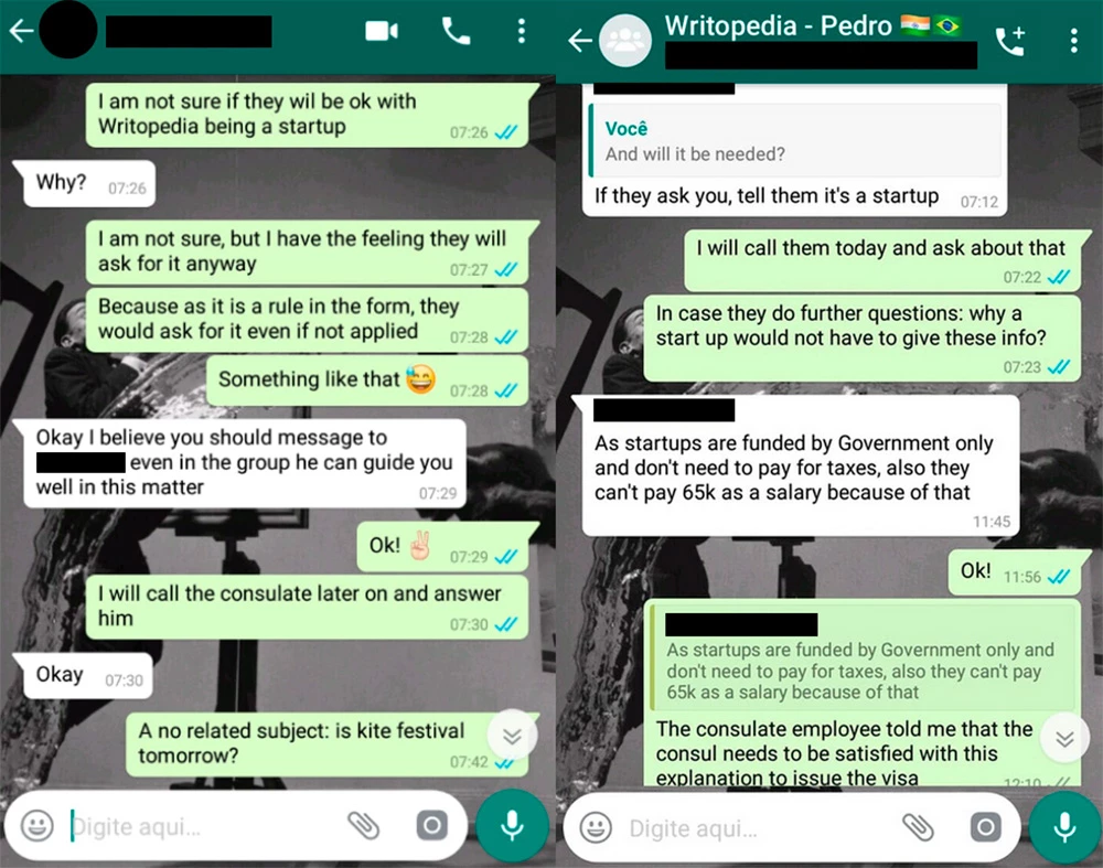 Enquanto eu estava no consulado negociando o visto rejeitado, membros da Aiesec sugerem omitir informações em nova requisição de visto de voluntariado, na modalidade X-Entry Visa. Para isso, forneceriam novos documentos que não falariam em startup, trabalho ou dinheiro.