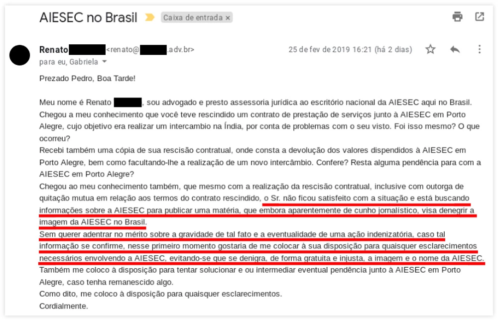 Advogado da Aiesec no Brasil questiona o cunho jornalístico de meu trabalho, afirma que minha apuração visa manchar a imagem da ONG e sugere que haverá ação indenizatória caso a matéria seja publicada. Toso recebeu a ameaça como cópia em seu e-mail.