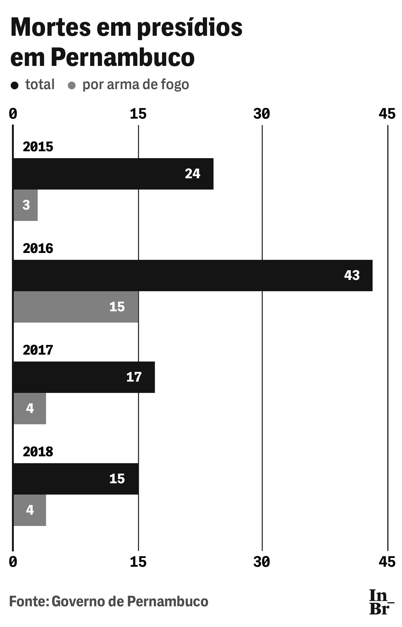 Só neste ano, outros “incidentes individuais” já deixaram quatro mortos e 12 feridos por arma de fogo dentro de presídios da região. E esse fenômeno não começou agora. Dos 15 assassinatos registrados dentro de unidades prisionais do estado em 2018, quatro foram por arma de fogo. Dos 17 mortos em 2017, quatro foram a tiros. E 2016 foi ainda mais crítico: dos 43 mortos sob responsabilidade do estado de Pernambuco, 15 foram por armas de fogo.