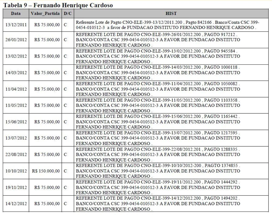 A segunda imagem encaminhada por Pozzobon era de um laudo da Polícia Federal daquele mesmo ano, que mostrava que a Odebrecht havia feito pagamentos mensais que somaram R$ 975 mil ao iFHC entre dezembro de 2011 e de 2012.