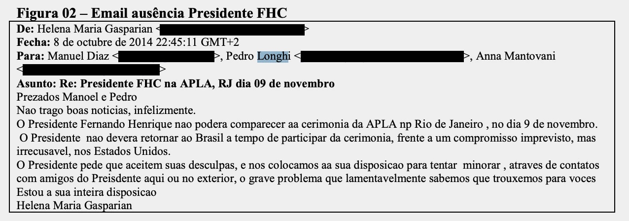 A primeira é uma troca de e-mails de 2014 entre a secretária de FHC e dois interlocutores: um representante da Associação Petroquímica e Química da Argentina, a Apla, identificado como Manuel Diaz, e um empresário do ramo cultural, Pedro Longhi. A secretária fala para verificarem com a Braskem – empresa do ramo petroquímico controlada pela Odebrecht – qual a “melhor maneira para [a empresa] fazer a doação [para o iFHC]”.