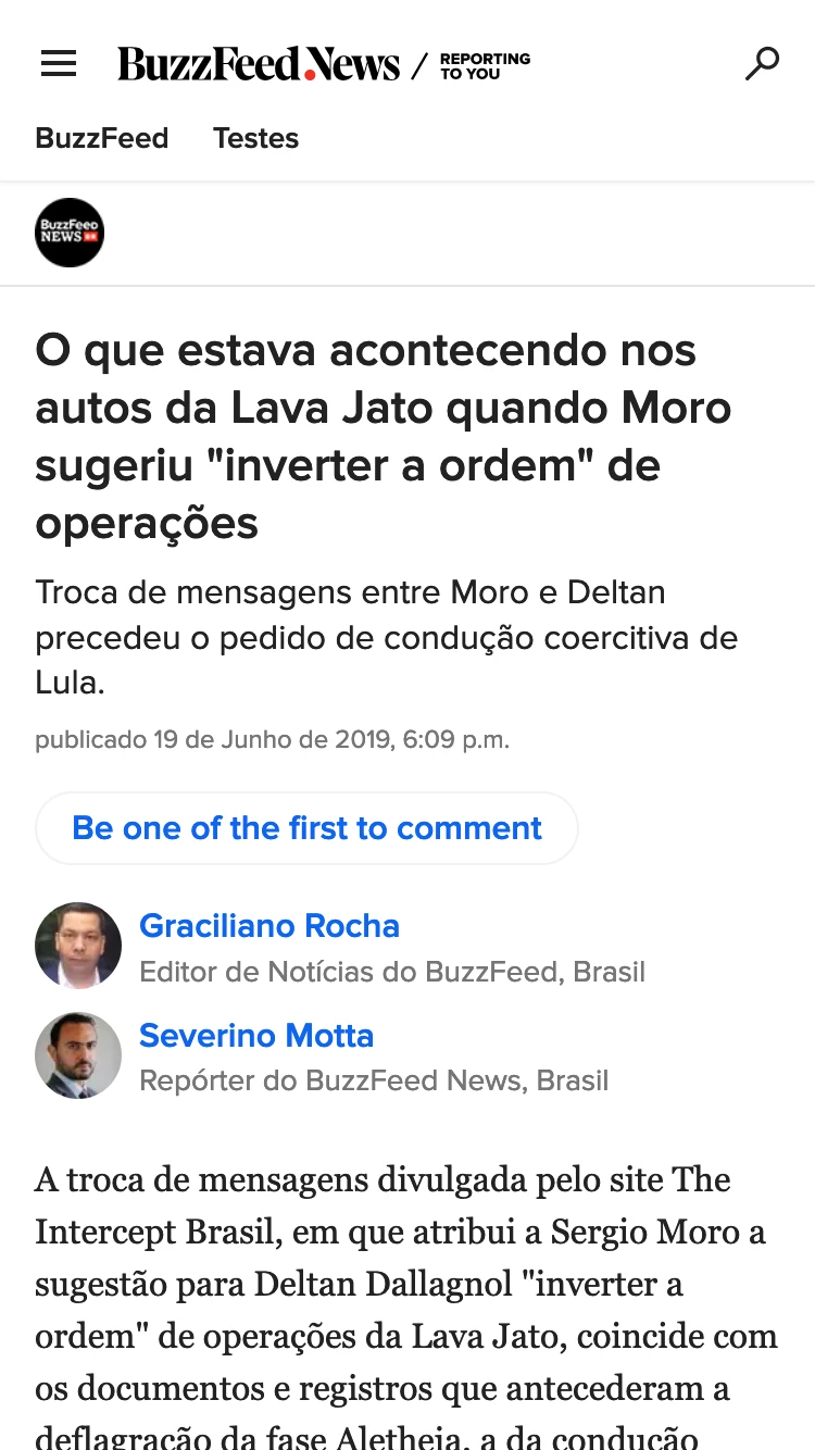 O primeiro deles foi o BuzzFeed News, num artigo publicado no dia 13 de junho. Os três repórteres que assinam a matéria explicam que o site “cruzou nos últimos dias as mensagens e os atos da procuradoria e do juiz nas mesmas datas nos processos citados.” Apontando para vários exemplos documentados, os repórteres concluem, como bem resumido na manchete: “Documentos mostram que atos da Lava Jato coincidiram com orientações de Moro no Telegram.”