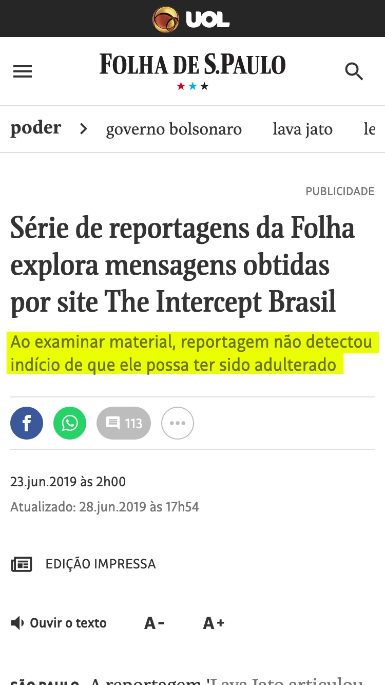 Os repórteres, por exemplo, buscaram nomes de jornalistas da Folha e encontraram diversas mensagens que de fato esses profissionais trocaram com integrantes da força-tarefa nos últimos anos, obtendo assim um forte indício da integridade do material.