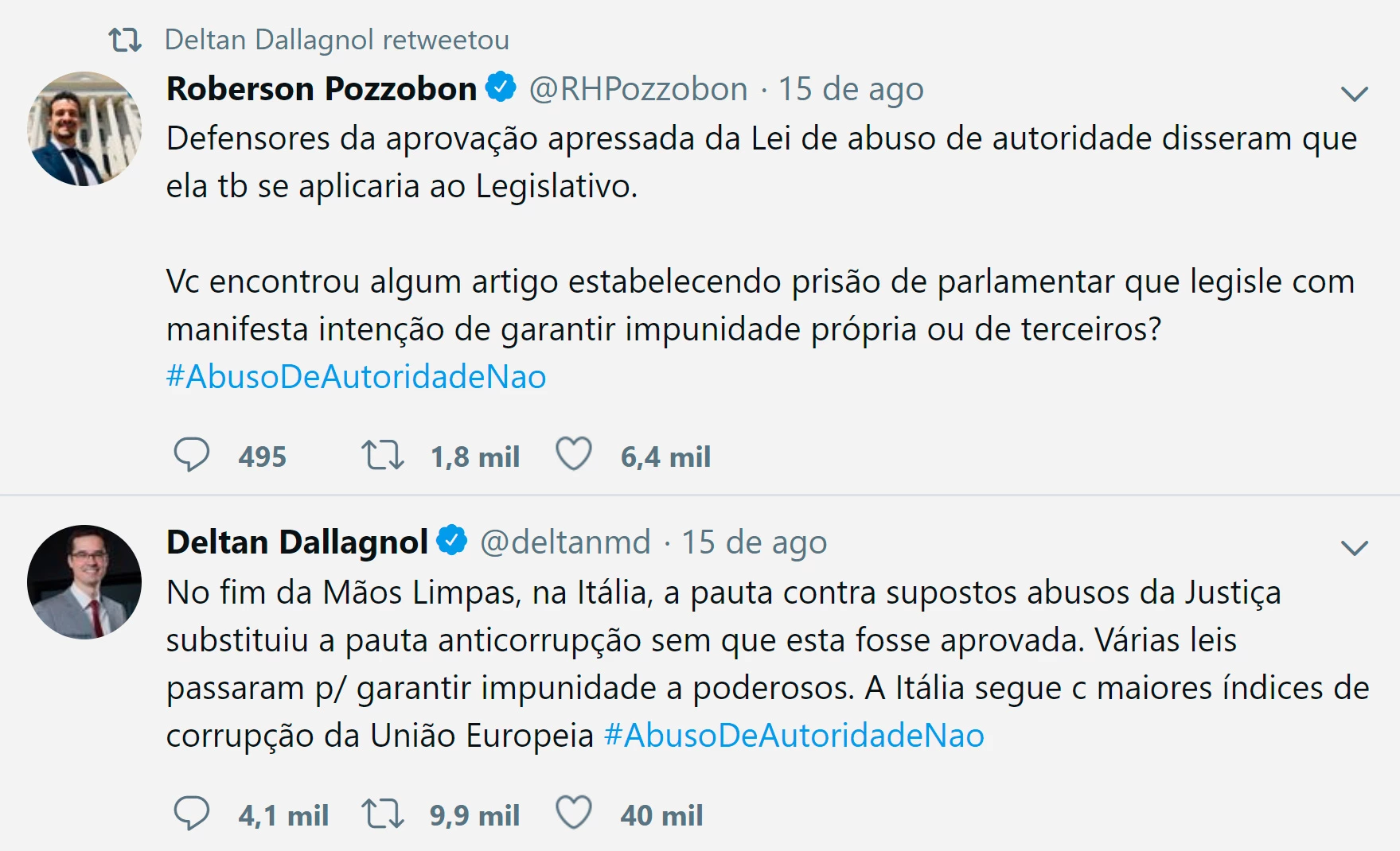 Assim como outros críticos, o procurador Roberson Pozzobon tem dito que o projeto foi aprovado “com pressa” e sem passar por um debate. É mentira. O debate vem sendo feito há pelo menos dez anos, quando a proposta começou a tramitar no Congresso, muito antes da Lava Jato existir. E não são apenas os integrantes do Ministério Público e do judiciário que passarão a ser passíveis de sanção pela nova lei. Servidores públicos, militares, membros do Executivo, do Legislativo, dos tribunais e conselhos de contas também serão. Insinuar que se trata de uma ação contra a Lava Jato é só mais uma maneira de confundir a opinião pública.
