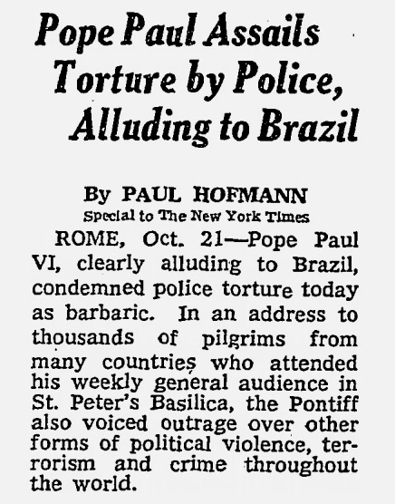 O Papa Paulo VI também discursou contra a barbárie cultivada pelos militares brasileiros em discursos de sua janela no Vaticano, em 1970. O então ditador-presidente Emílio Garrastazu Médici respondeu às críticas do pontífice alegando que os que diziam tais coisas sobre o Brasil eram“maus brasileiros, comunistas e subversivos”. Maus brasileiros… Os militares brasileiros se agarraram com unhas, dentes, coturnos e óculos escuros ao patriotismo e às patriotadas.