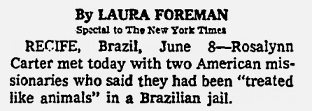 Notícia publicada no NYT em 1977 na qual relata que Rosalynn Carter, esposa do presidente dos EUA, “encontrou-se hoje com dois missionários americanos que disseram ter sido ‘tratados como animais’ em uma prisão brasileira.”