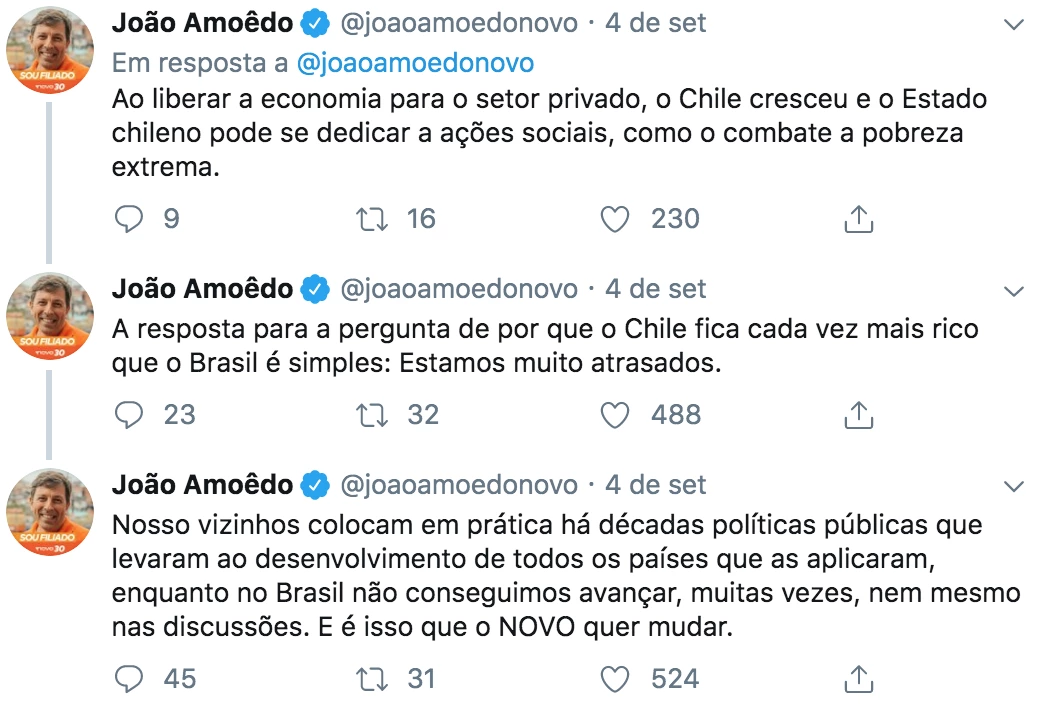 Os tarados pelo ultraliberalismo chileno até pouco tempo veneravam o país vizinho. O ex-banqueiro João Amoêdo, o CEO do partido mais fiel aos projetos bolsonaristas no Congresso, foi ao Twitter no mês passado contar porque o Chile virou um paraíso de bem-estar, riqueza e prosperidade. Assim como Guedes, exaltou as reformas liberais de Pinochet, a responsabilidade fiscal do governo, a agilidade para se abrir novas empresas e outros sensos comuns da velha cartilha liberal.