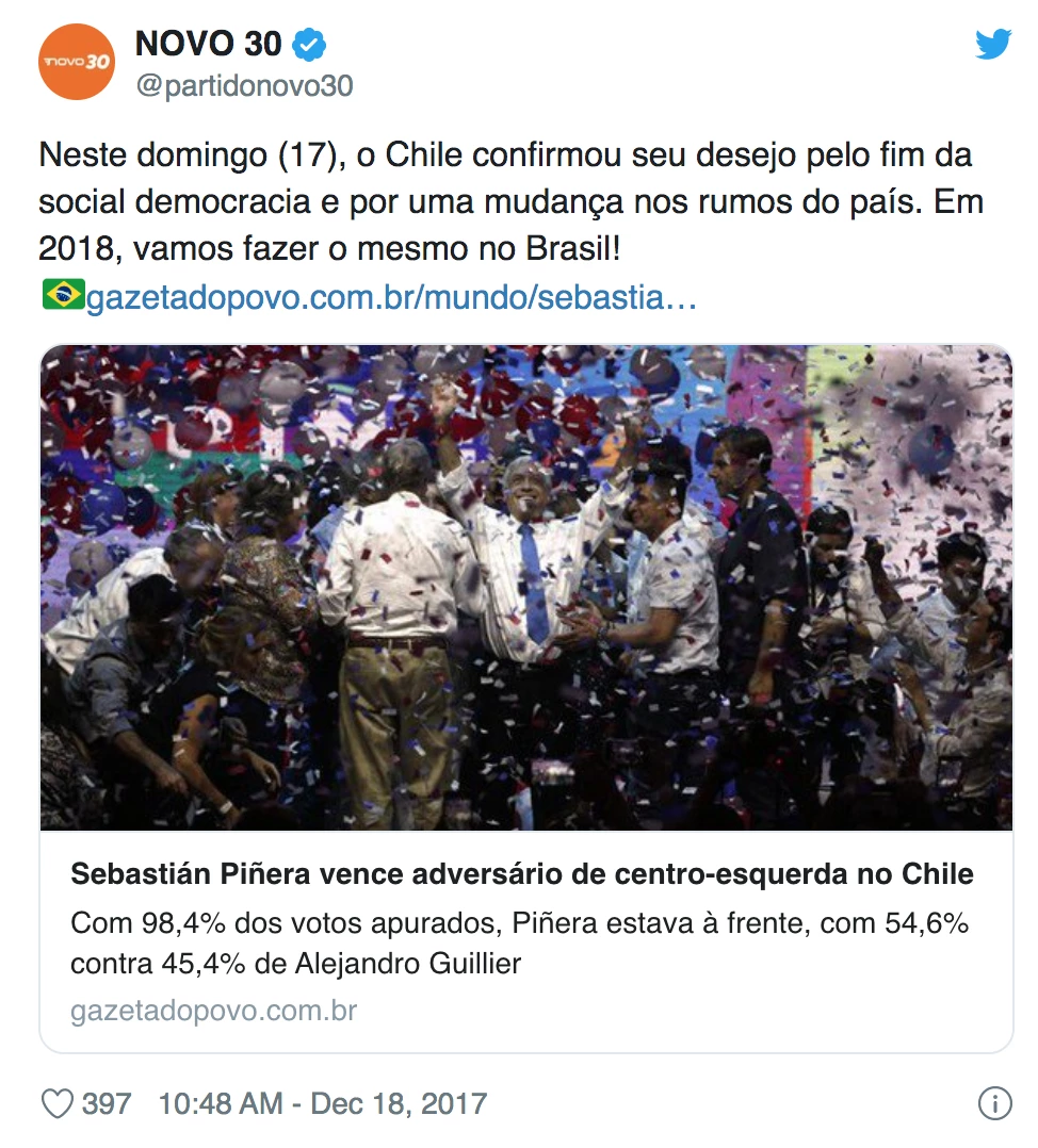 Quando Sebastián Piñera foi eleito em 2017, o partido Novo comemorou o “fim da social-democracia” e desejou o mesmo para o Brasil. Os sonhos da sigla se realizaram: Bolsonaro e seus Chicago boys estão no poder e contam com o apoio político do Novo para seguir os passos chilenos. A combinação entre um governo autoritário e uma economia 100% livre parece ser mesmo o sonho de qualquer ultraliberal.
