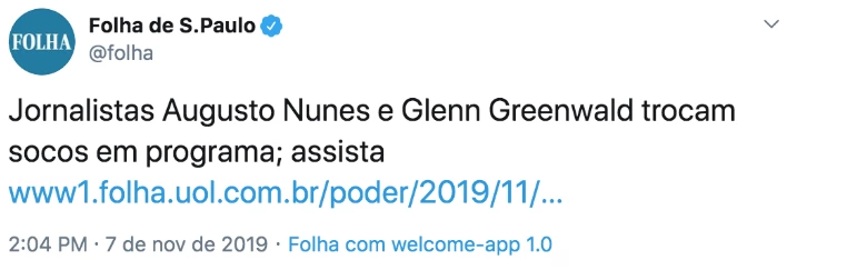 No Twitter, a Folha chamou a agressão de “troca de socos”. Como se as imagens não fossem suficientemente claras para identificarmos um agressor e um agredido se defendendo. Claro, o jornalismo isentão precisa sempre se colocar numa posição de equidistância para não magoar ninguém. Mesmo que para isso seja necessário mentir.