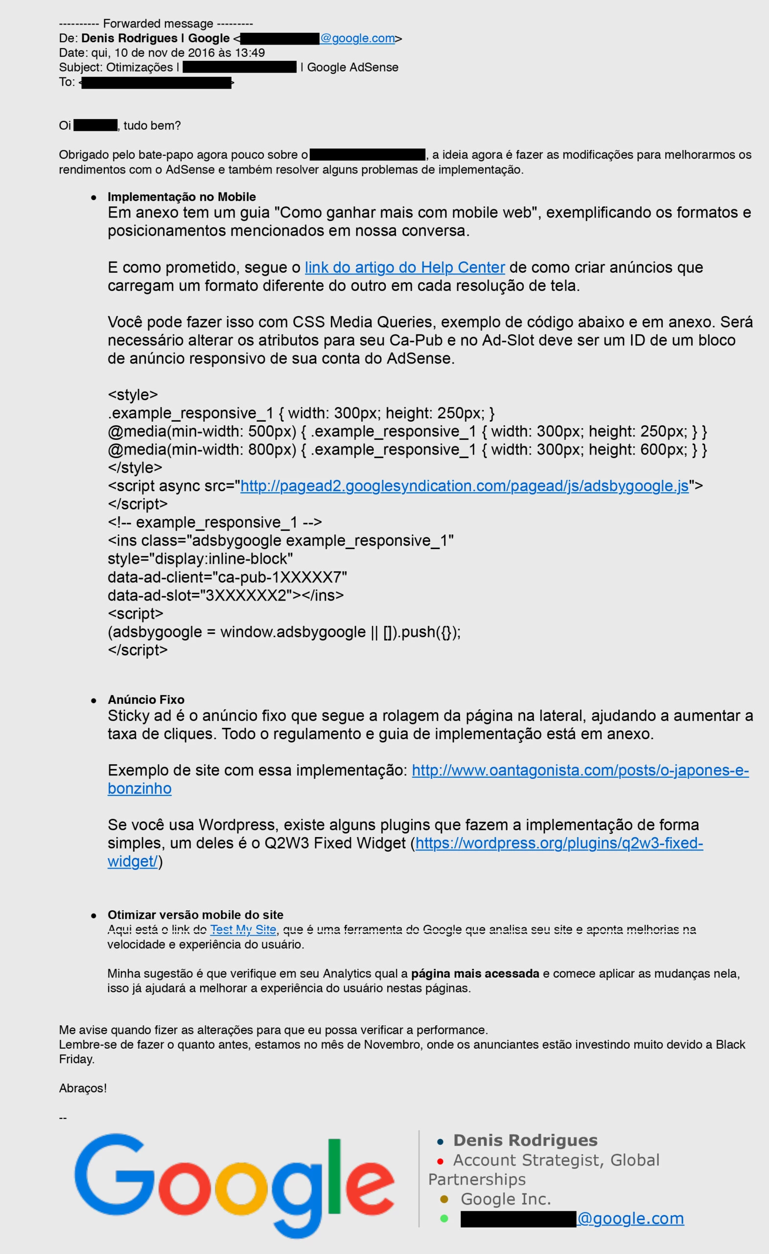 Os blogueiros também aprenderam como usar as ferramentas do Google para aumentar a audiência, a relevância e, assim, os lucros. Para isso, contaram com o auxílio técnico da empresa. Em novembro de 2016, Denis Rodrigues, na época estrategista de contas e parcerias globais do Google, enviou ao ex-blogueiro um e-mail com dicas técnicas para implementar os anúncios do AdSense em celulares. De novo, o exemplo usado foi O Antagonista. Não é por acaso: para vender a tecnologia, o Google procura exemplos que tenham afinidade com o cliente. E a empresa sabia com quem estava falando.