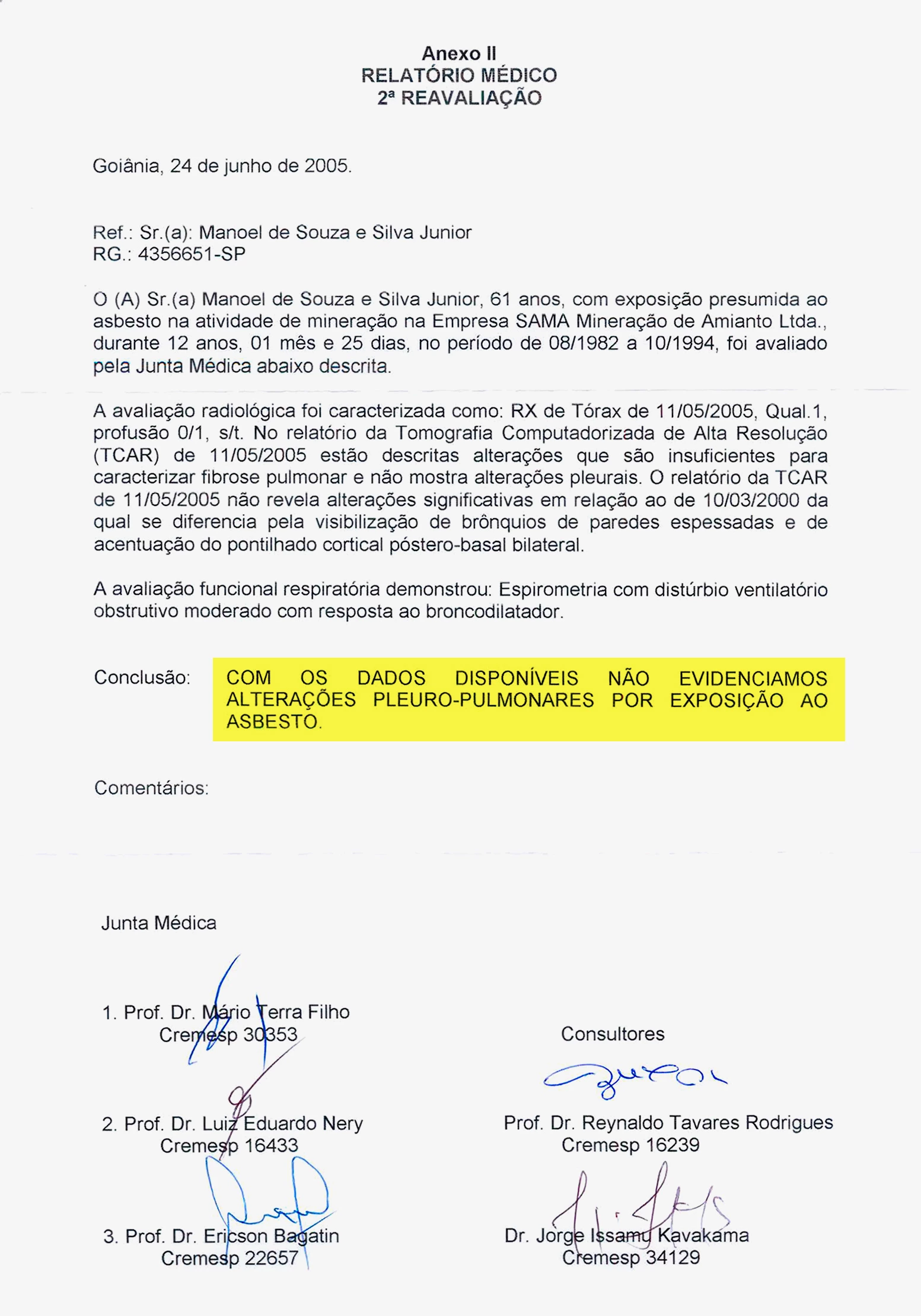 Ao comparar esse exame com outro que tinha feito pela Sama há alguns meses, Silva Júnior descobriu que a mancha já estava lá, mas havia sido ignorada pelos médicos da mineradora. O laudo de 24 de junho de 2005, assinado pelos médicos da junta Ericson Bagatin, Luiz Eduardo Nery e Mário Terra Filho, afirmava que nenhuma alteração respiratória relacionada ao asbesto tinha sido identificada.