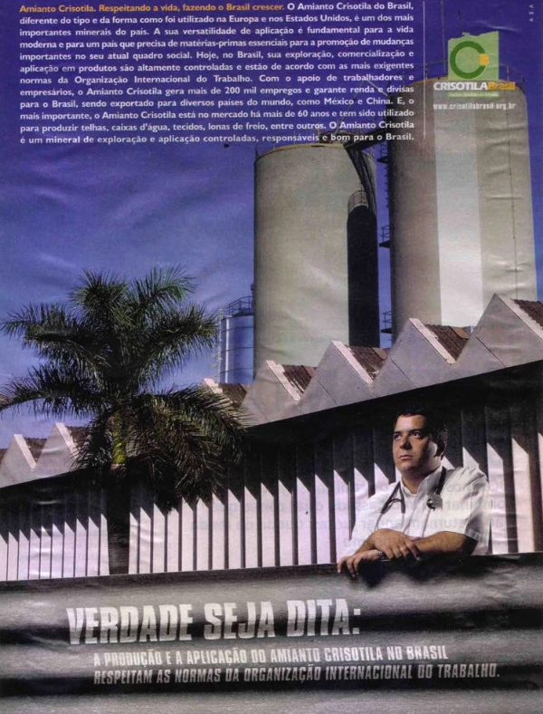 Ribeiro e os outros médicos especialistas em saúde do trabalho ligados à empresa ajudam nessa estratégia. Além de trabalhar para a Sama como médico do trabalho, Ribeiro, por exemplo, também serviu de garoto propaganda da empresa em anúncios publicados por diversas revistas nacionais, entre elas a Veja. Nas peças, se lia que “o amianto crisotila é um mineral de exploração e aplicação controladas, responsáveis e bom para o Brasil”. Vestindo jaleco branco e com um estetoscópio pendurado no pescoço, o médico usava sua imagem para dar credibilidade à ideia de que a fibra cancerígena, apelidada de pó da morte, não provoca danos à saúde.