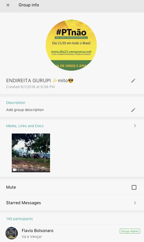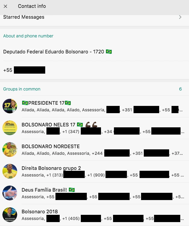 O número de telefone de Flavio Bolsonaro também foi encontrado em nove grupos pró-Bolsonaro do WhatsApp como criador e como um dos administradores de grupos.