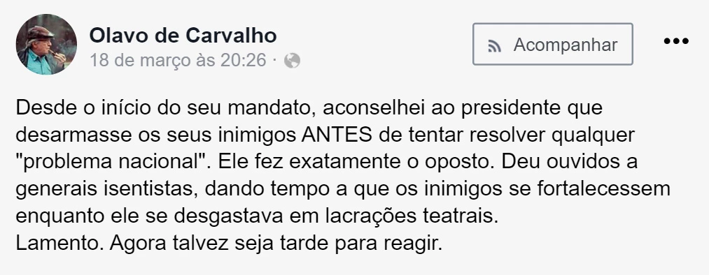 Até Olavo de Carvalho, o mentor do bolsonarismo, o farol intelectual dos governistas, está decepcionado. Ele tem criticado Bolsonaro e diz que “agora talvez seja tarde para reagir”. O diagnóstico do lunático da Virgínia é formidável: o mesmo presidente que nomeou vários ministros indicados por Olavo e vários de seus alunos não teria escutado os seus conselhos.
