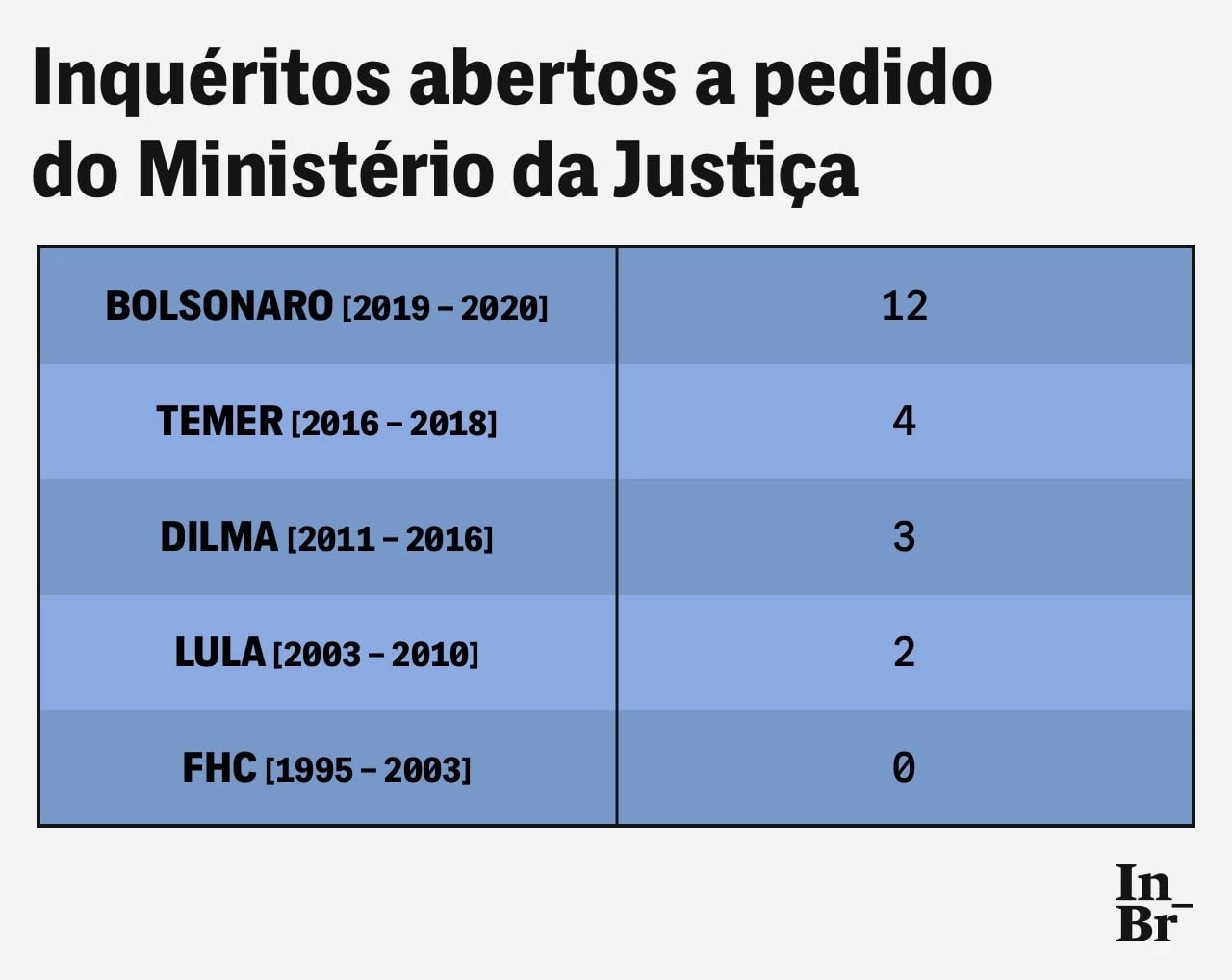 Os dados, enviados pela própria pasta comandada por Moro, indicam que o agora ex-ministro pediu 12 investigações do tipo em seus 16 meses incompletos no governo. É mais do que todas as investigações sobre crimes a honra pedidas pelos ministros da Justiça que serviram a Michel Temer, Dilma Rousseff, Luiz Inácio Lula da Silva e Fernando Henrique Cardoso somadas.