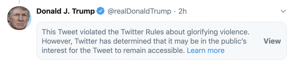 A ameaça de que militares iriam atirar contra manifestantes em Minneapolis feita por Donald Trump, divulgada em um tuíte, levou o Twitter a restringir o acesso à mensagem do presidente, declarando que a mesma violava a política da rede social contra a “glorificação da violência“.