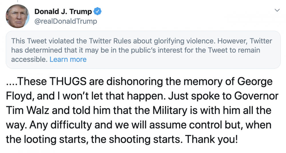 A ameaça de que militares iriam atirar contra manifestantes em Minneapolis feita por Donald Trump, divulgada em um tuíte, levou o Twitter a restringir o acesso à mensagem do presidente, declarando que a mesma violava a política da rede social contra a “glorificação da violência“.