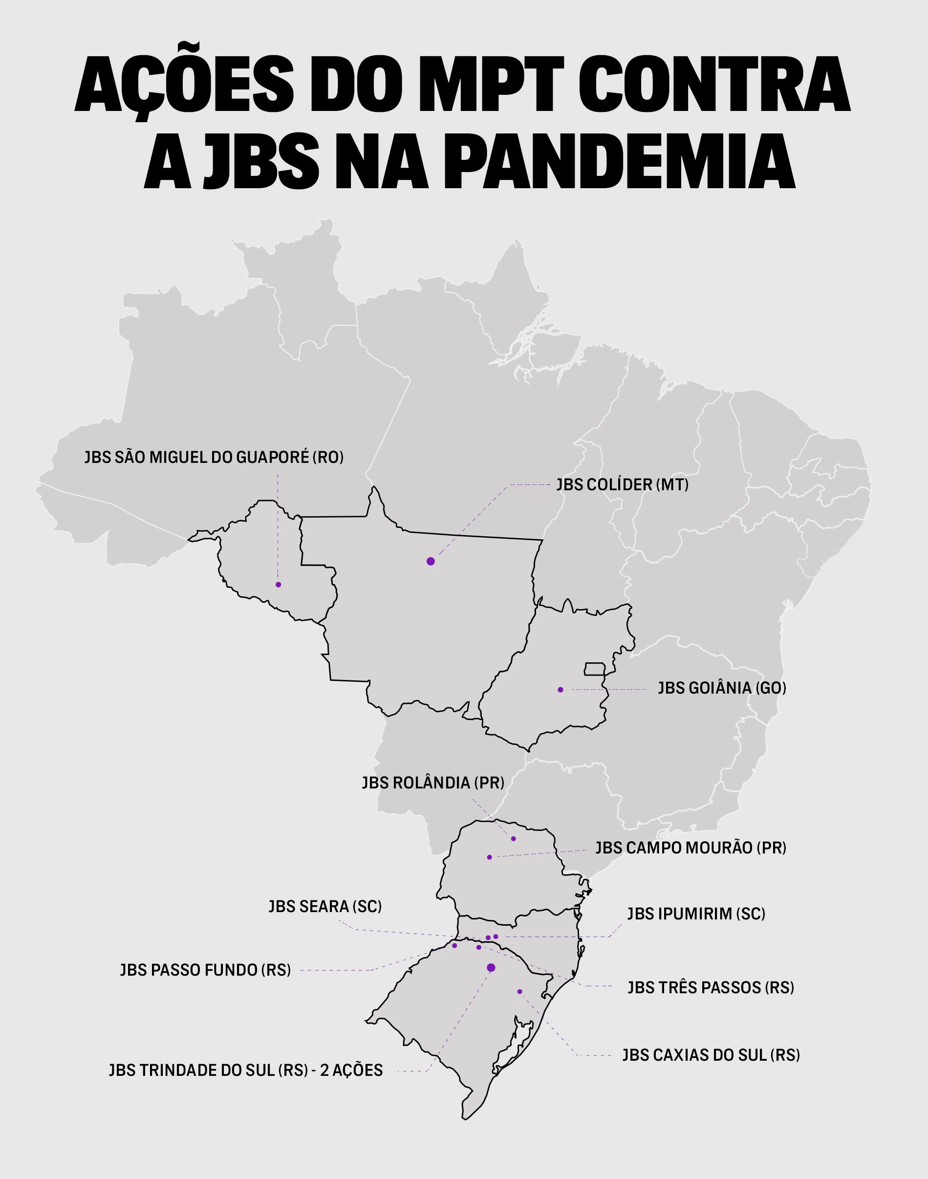 A JBS também se destaca como frigorífico campeão de ações do MPT na pandemia. Já são 12 no país, todas citando problemas de falta de cuidados para proteger trabalhadores do novo coronavírus. Unidades de SC, RS e RO já chegaram a ter a operação interrompida por decisão judicial após denúncias do MPT apontarem que os locais eram focos de proliferação do vírus.