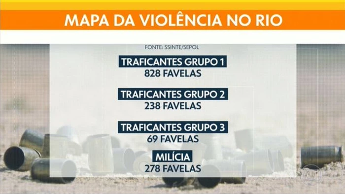 Mais recentemente, no início de julho, um relatório divulgado pela Polícia Civil mapeou 1.413 favelas dominadas por traficantes e milicianos. O documento mostrava que o Comando Vermelho dominava 828 favelas; as milícias, 278; Terceiro Comando, 238 e Amigo dos Amigos, 69. Essa informação, porém, chegou um tanto maquiada para os telespectadores da Globo: ao longo do dia 7 de julho, os telejornais da emissora exibiram a informação sobre os domínios de favelas por tráfico e milícias denominando as facções como “Traficantes Grupo 1”, “Traficantes Grupo 2” e “Traficantes Grupo 3”.