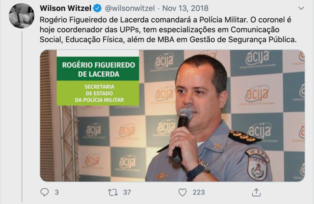 Witzel já tinha feito o convite ao coronel Victor Yunes para o cargo. A indicação caiu nos 45 do segundo tempo. A bola ficou com Rogério Figueredo de Lacerda, ex-comandante do 18º Batalhão, em Jacarepaguá. Durante a gestão de Figueiredo de Lacerda no 18º, as mortes cometidas por policiais triplicaram na área.