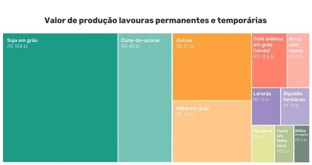 Soja, cana de açúcar e milho correspondem à maior parte da produção das lavouras brasileiras.