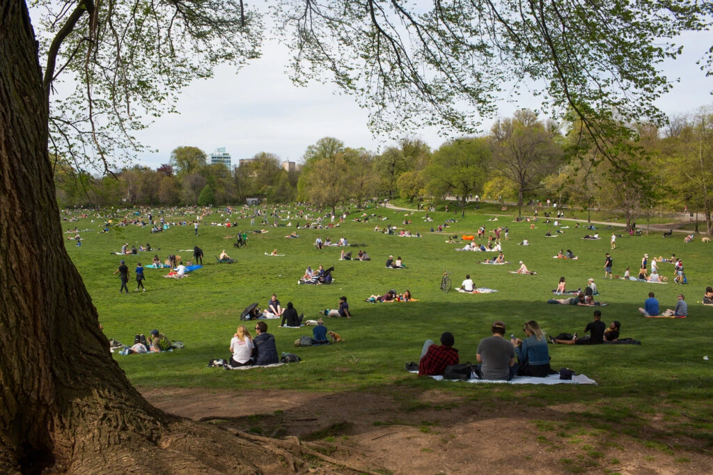 O parque do meu bairro no Brooklyn ganhou vida como nunca antes: é uma academia ao ar livre, uma pista de dança ao ar livre, as pessoas trazem seus tapetes de ginástica e um telefone para seus treinamentos online de alta intensidade ou uma aula de ioga. As pessoas estão fazendo kickboxing, pulando corda, suando sob o monumento aos mártires do navio-prisão britânico. Eu assisto a equipes de filmagem formadas por uma mulher só, gravando seus amigos para um vídeo do TikTok. A vida noturna também se mudou para o parque: piqueniques, pequenas festas, um casal enrolado em um cobertor porque não há outro lugar para ir. Cada forma, cor e tamanho se misturam no parque. Recentemente, notei que o zumbido e a ameaça de um gerador e refletores policiais sumiram. Embora estivessem lá ostensivamente para oferecer segurança, o barulho e o brilho perseguiam, criando uma atmosfera ameaçadora de um filme distópico sobre vigilância, anomia e o fim do mundo. Sua ausência trouxe calma, alívio e festa. E foi substituído por sessões noturnas de bateria.
