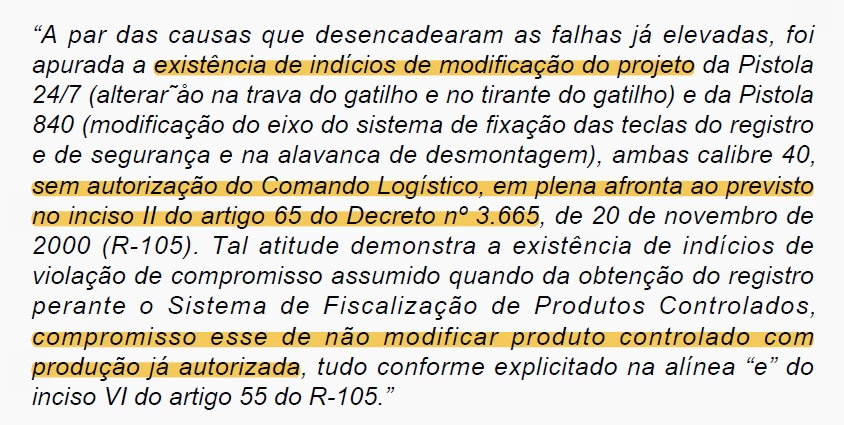 O Exército concluiu que a “empresa realizou modificações (…) contrariando o anteriormente aprovado em Relatório Técnico Experimental (ReTEx)” e que a Taurus não tem provas de que as mudanças verificadas “estavam autorizadas pelo Exército”.