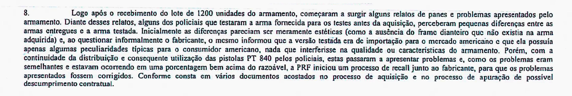 Diante dos relatos de falhas apresentados pela PT-840, instrutores que haviam participado dos testes avaliaram as armas compradas e notaram “pequenas diferenças entre as armas entregues e a arma testada”. A Taurus, segundo o documento, foi informalmente questionada por um dos policiais que haviam testado e aprovado o modelo e afirmou que “a versão testada era de importação para o público americano” e que possuía peculiaridades para aquele público, mas “nada que interferisse na qualidade”, confirmando que a PRF foi ludibriada. Testou um modelo, mas as armas entregues eram diferentes.