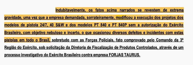 Segundo o MP paraibano, que desde 2017 investiga falhas em armamentos da empresa no estado, a empresa “dolosamente, modificou” as armas e “a execução dos projetos (…) sem a autorização do Exército Brasileiro, com objetivo nebuloso e incerto”. A pedido dos promotores, as forças armadas analisaram 1.759 armas apreendidas na fábrica da Taurus no Rio Grande do Sul.