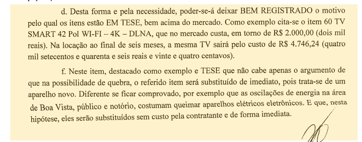 Todo esse esforço para explicar o negócio foi necessário antes mesmo da assinatura do contrato e da abertura do processo do TCU. A assessoria jurídica do 2º Grupamento de Engenharia, que fica em Manaus e ao qual o 6º BEC é subordinado, já havia alertado em 20 de julho que a coisa estava mal explicada. O tenente-coronel Marcos da Silva Castro, chefe da assessoria jurídica, citou o exemplo da televisão que custava cerca de R$ 2 mil no mercado, mas cujo aluguel por seis meses sairia a R$ 4.746,24. “Não cabe apenas o argumento de que na possibilidade de quebra, o referido item será substituído imediatamente, pois trata-se de um aparelho novo”.